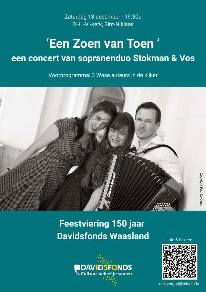 Een concert van sopranen duo Astrid Stockman en Liesbeth Devos en drie Wase auteurs die in de schijnwerpers geplaatst worden: met die ingrediënten wordt in het Waasland 150 jaar Davidsfonds gevierd op zaterdag 13 december 2025 in Sint-Niklaas.
